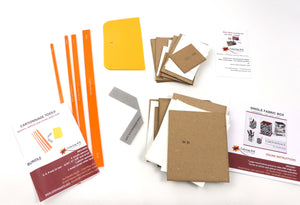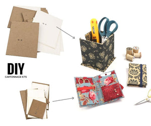 This is a great CARTONNAGE STARTER KIT. Included in the kit you will have all basic cartonnage tools (4 acrylic spacers, 1 metal corner miter tool, 1 plastic spatula), plus one DIY kit to make a single box and a DIY kit to make two mini sewing kits (as shown in pictures). Fabric is not included. The instructions to make the box and the mini sewing kit are in a Free eBook that you can click here to download to your computer.